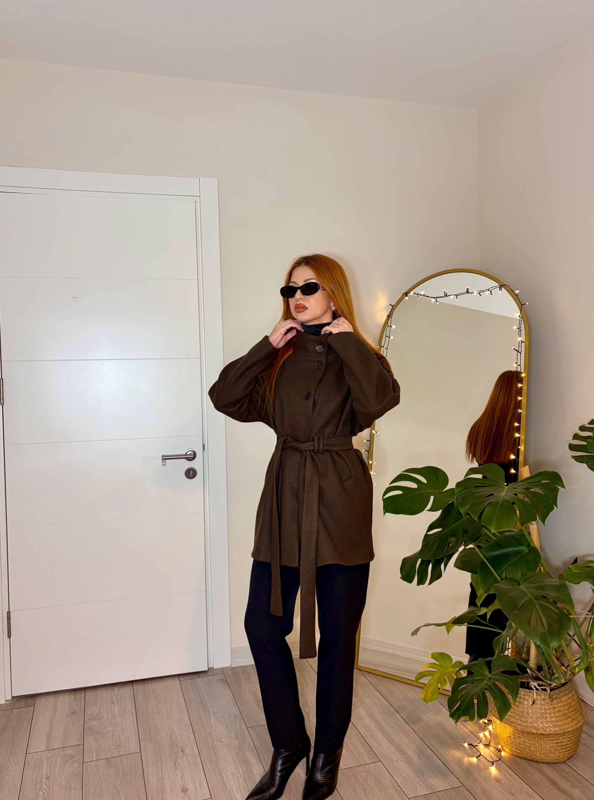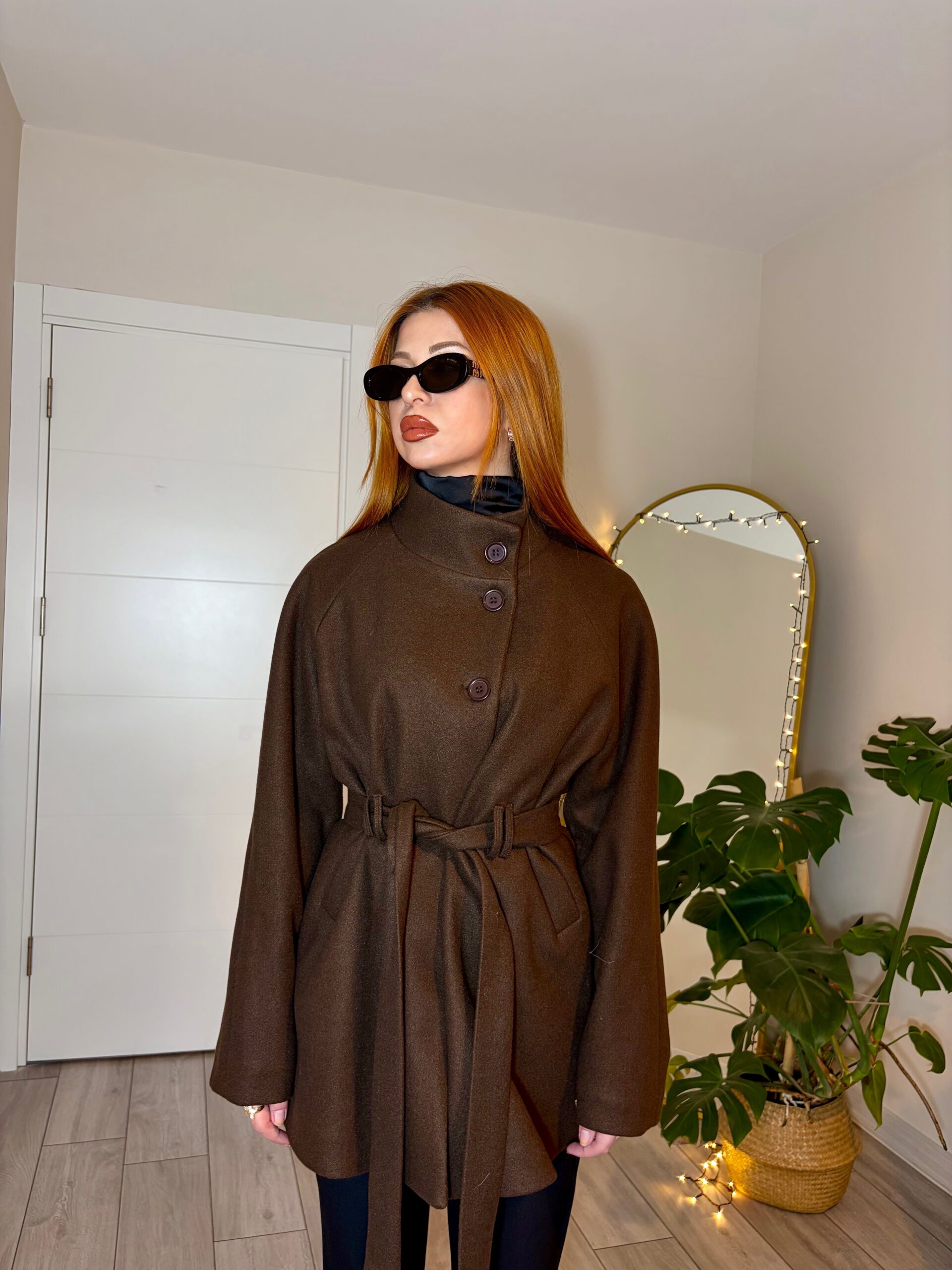 Minimal ve zamansız tasarımıyla öne çıkan kahverengi kuşaklı kaşe kaban, hem günlük kombinde hem de şehir stilinde şık bir görünüm sunar. Yüksek yaka detayına sahip olması sayesinde rüzgâra karşı koruma sağlar ve modern bir siluet oluşturur. Asimetrik düğme hattı ve belden bağlamalı kuşağı ile vücut formunu zarifçe vurgular.